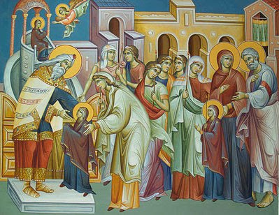 Mária bemutatásának (latinul: Praesentatio Mariae) dátumát a hagyomány szerint határozták meg: a lánygyermekeket hetven nappal születésük után mutatták be az Úrnak a templomban. Jakab apostol apokrif ősevangéliumában szerepel, hogy Máriát hároméves korában szülei a templomban Istennek ajánlották. A művészek a századok során általában ezt a jelenetet ábrázolták.