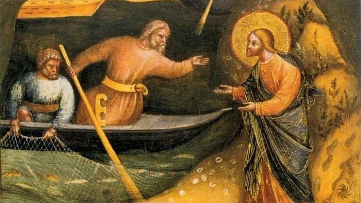 A Galileai-tenger mentén járva meglátott két testvért: Simont, akit Péternek is neveznek, és Andrást, a testvérét. Éppen hálót vetettek a tengerbe, mert halászok voltak. Így szólt hozzájuk: „Kövessetek engem, és én emberek halászává teszlek titeket!” Erre azok otthagyták hálóikat és követték őt. Amint onnan továbbment, meglátott másik két testvért is: Zebedeus fiát, Jakabot és testvérét, Jánost. Apjukkal, Zebedeussal a hálóikat javították a csónakban. Őket is elhívta. Ők is otthagyták a csónakot és az apjukat, és követték őt.