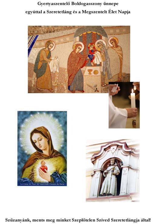 A mai ünnepen arra emlékezünk, hogy Szűz Mária, negyven nappal Jézus születése után, bemutatta gyermekét a jeruzsálemi templomban. A szokásnak megfelelően a szülők, Mária és József áldozatként két gerlicét vagy galambfiókát ajánlottak fel, és az Úrnak szentelték az elsőszülött fiút. A mózesi törvény szerint előírt áldozat fölajánlásakor jelen volt Anna és Simeon is, aki a nemzeteket megvilágosító világosságnak nevezte Jézust.
