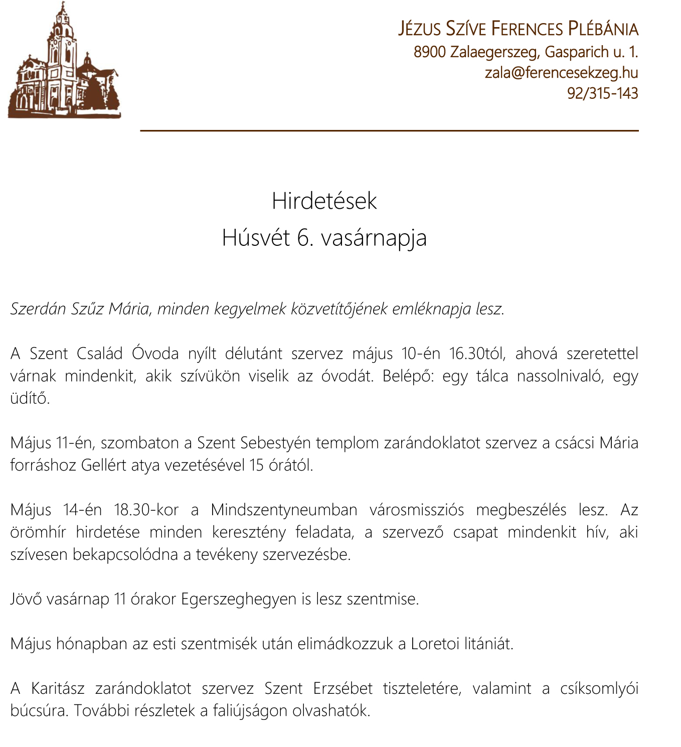 HIRDETÉSEK HÚSVÉT 6. VASÁRNAPJA