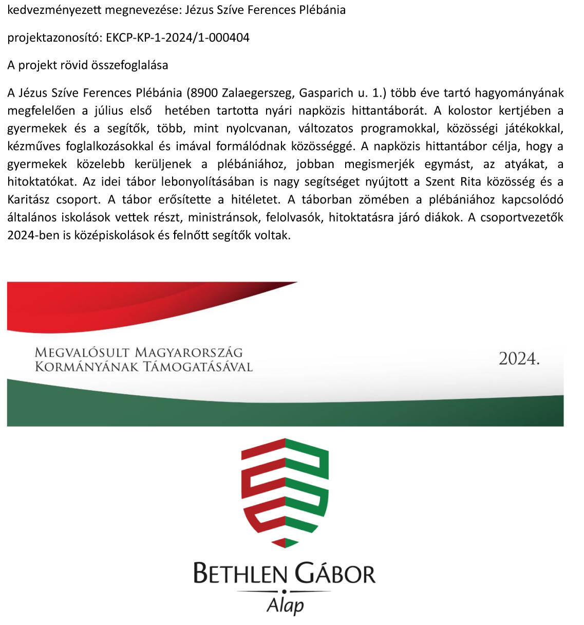 A Jézus Szíve Ferences Plébánia – támogatás elszámolásáról készült dokumentumok: