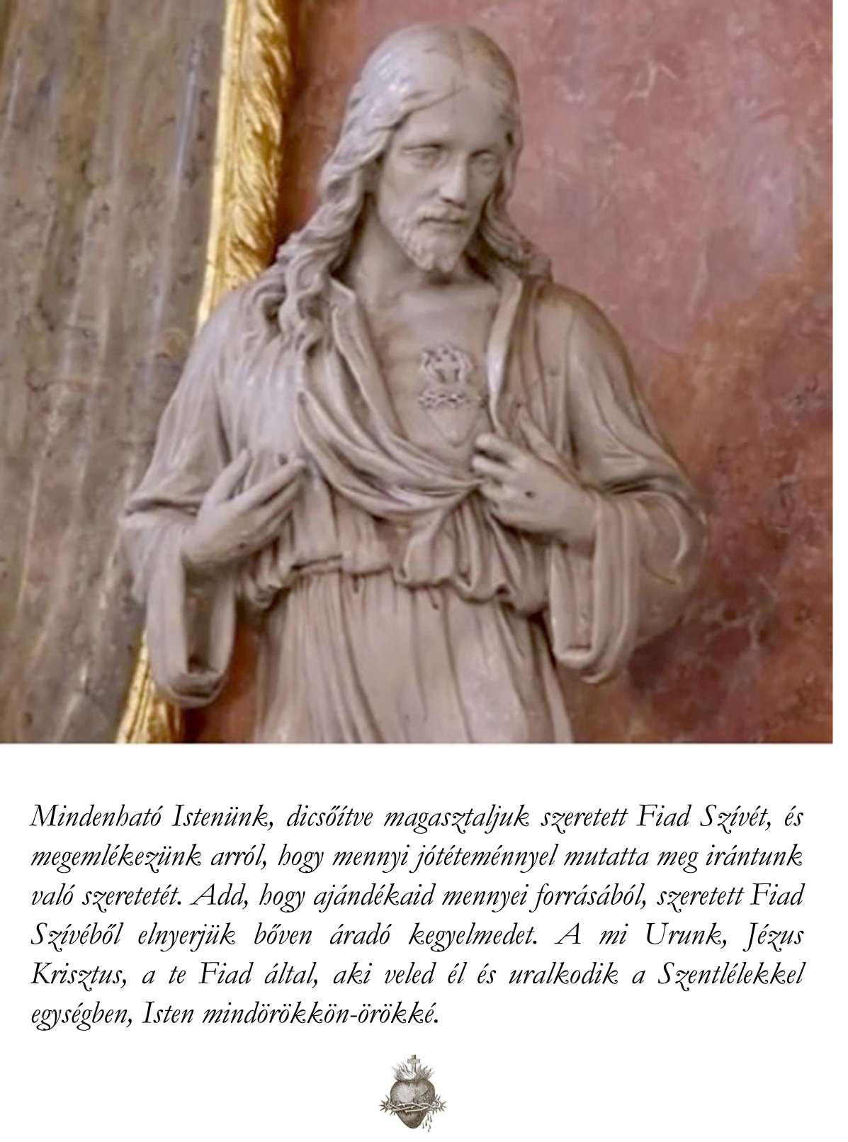Édes Jézus, az emberiség Megváltója, tekints reánk, akik oltárod előtt alázatosan leborulunk. Tieid vagyunk, tieid akarunk lenni. Hogy pedig szorosabban egyesülhessünk veled, mindegyikünk felajánlja magát szentséges Szívednek. Sokan még nem ismertek meg, mások parancsaidat megvetették és eltaszítottak maguktól. Könyörülj mindezeken, jóságos Jézus, és öleld valamennyiüket legszentebb Szívedre. Légy királya, Urunk, nemcsak a hívőknek, akik sohasem pártoltak el tőled, hanem a tékozló fiúknak is, akik elhagytak. Add, hogy mihamarabb visszatérjenek az atyai házba és éhen-szomjan el ne vesszenek. Légy királya azoknak is, akiket tévedés ejtett meg, vagy szakadás választott el. Hívd vissza őket az igazság szolgálatára és a hit egységébe, hogy rövidesen egy akol legyen és egy pásztor. Adj, Urunk, Egyházadnak biztos és teljes szabadságot, minden népnek békét és rendet. Tedd, hogy az egész földkerekség egy szózattól visszhangozzék: Köszöntsük az isteni Szívet, amely által üdvösségünk támadt; dicsértessék és áldassék mindörökké! Ámen