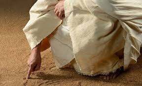 Jézus lehajolt, és az ujjával írni kezdett a földön. Ők azonban tovább faggatták. Erre fölegyenesedett, és azt mondta nekik: „Az vesse rá az első követ, aki közületek bűn nélkül van!” Aztán újra lehajolt, s tovább írt a földön. Azok meg ennek hallatára egymás után eloldalogtak, kezdve a véneken, s csak Jézus maradt ott a középen álló asszonnyal.