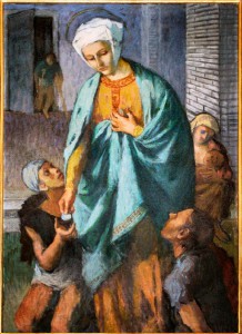 Az volt a szokása, hogy naponta kétszer, reggel és este, minden betegét személyesen meglátogatta, és a legutálatosabb betegségben szenvedőket saját maga ápolta: az egyiket megetette, a másikat lefektette. Voltak olyanok, akiket saját vállán hordozott, és az emberséges szeretet sokféle jótettével látta el őket. Mindezekben boldog emlékű férje tetszését is megnyerte. Végül pedig férje halála után a tökéletesség legmagasabb fokára törekedve, sok könnyhullatás közt azt kérte tőlem, engedjem meg neki, hogy ajtóról ajtóra járva alamizsnát kolduljon.