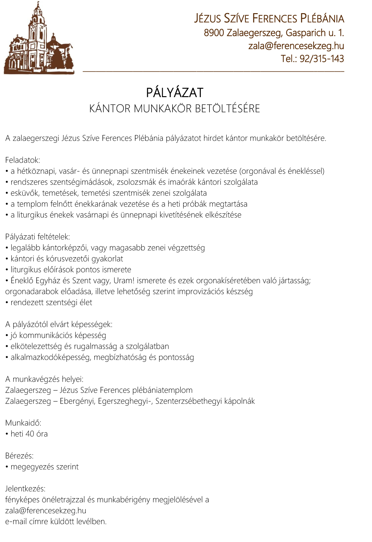 PÁLYÁZAT KÁNTORI MUNKAKÖR BETÖLTÉSÉRE