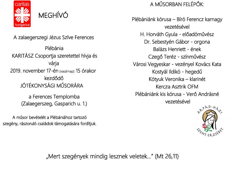 Meghívó honlap2 Közzétéve: 2019-11-06 - 752 × 592 - Szent Erzsébet-napi jótékonysági műsor templomunkban – 2019. 11. 17.