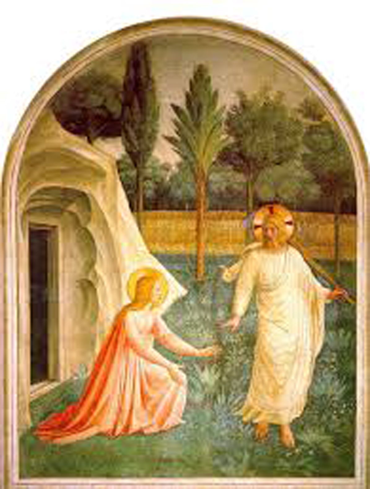 Jézus megkérdezte: „Asszony, miért sírsz? Kit keresel?” Mária Magdolna azt hitte, hogy a kertész az, és így válaszolt: „Uram, ha te vitted el, mondd meg, hová tetted, hogy magammal vihessem.” Jézus erre megszólította: „Mária!” Mária felkiáltott: „Rabbóni!” – vagyis „Mester”!