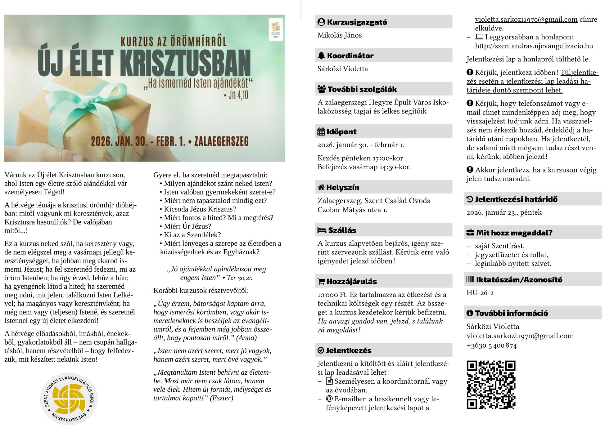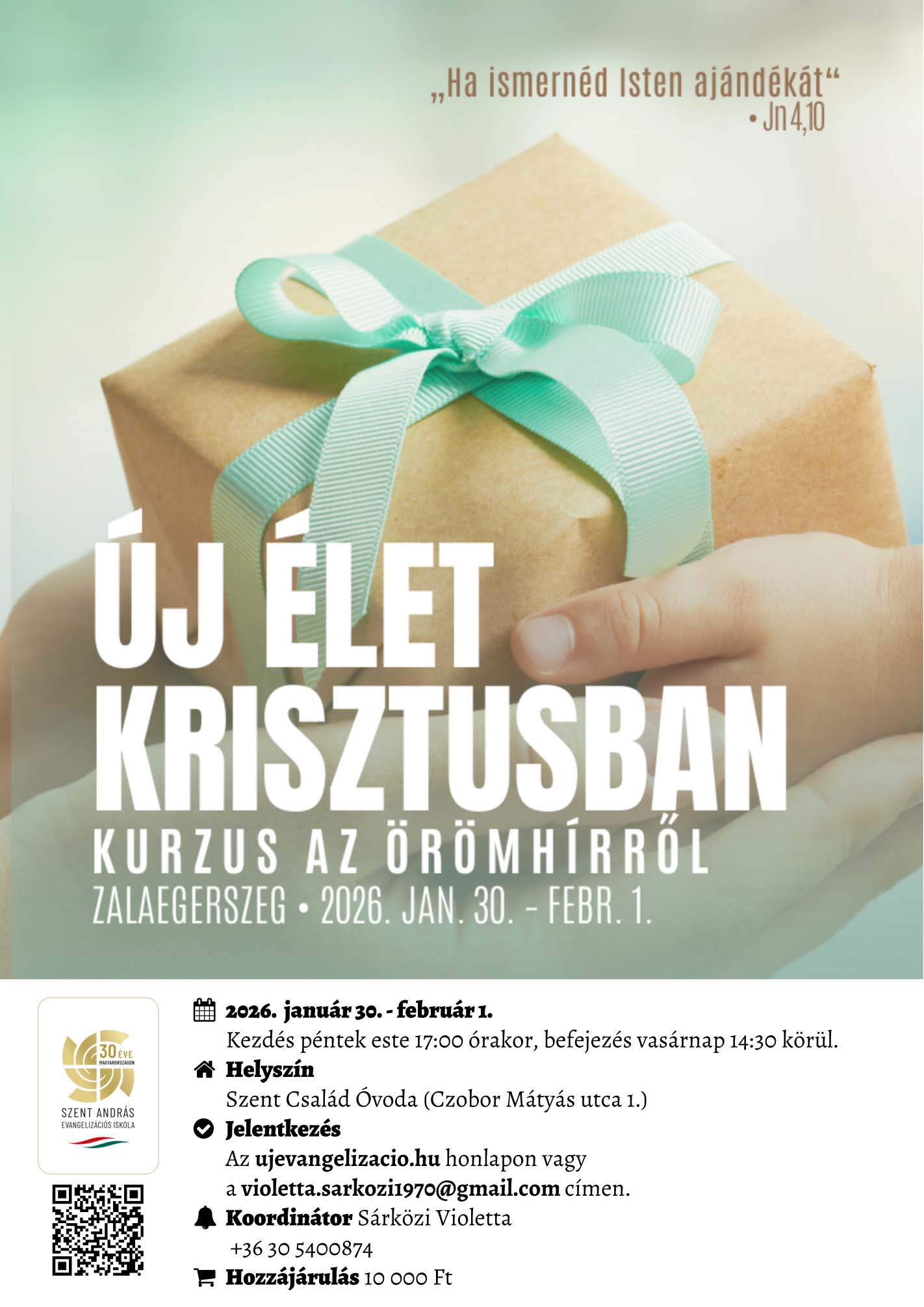 2026.01.30-02.01 között Új élet Krisztusban címmel hétvégi lelkigyakorlatot szervez a Szent András Evangelizációs Iskola a Szent Család Óvodában.
