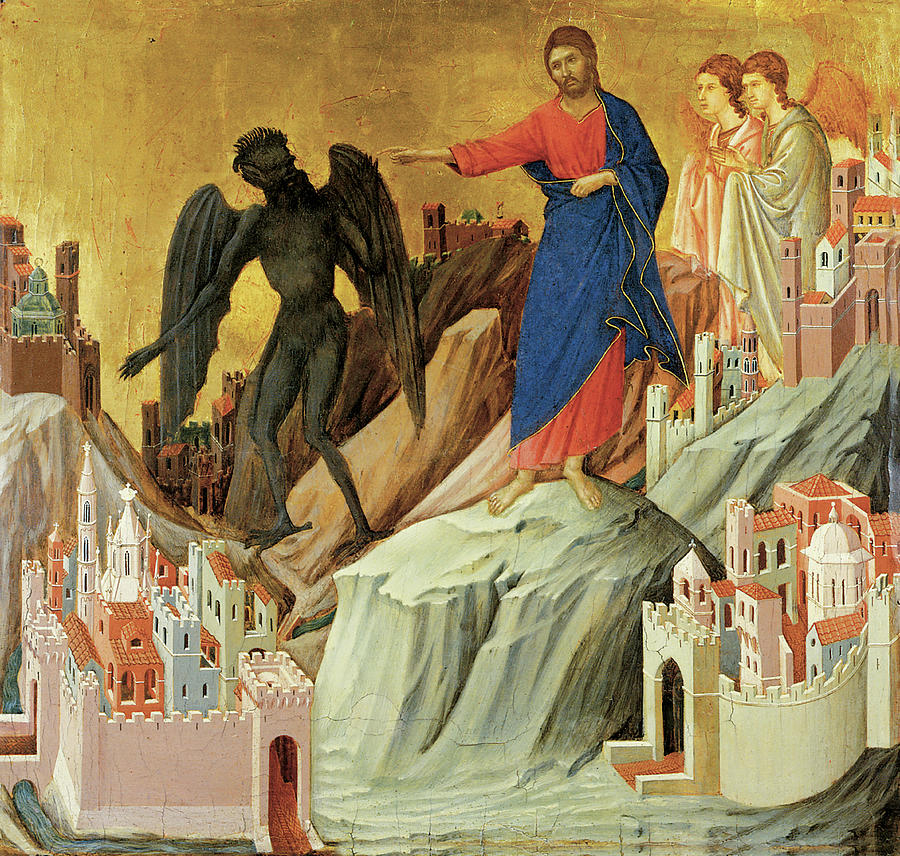 Végül egy igen magas hegyre vitte őt a sátán. Megmutatta neki a világ valamennyi országát és azok gazdagságát. Azután így szólt: „Ezt mind neked adom, ha leborulsz és imádsz engem!” Ekkor Jézus azt mondta neki: „Takarodj, sátán! Mert írva van: Uradat, Istenedet imádd, és csak neki szolgálj!”