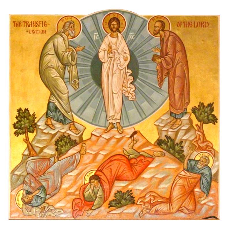Jézus maga mellé vette Pétert, Jakabot és (ennek) testvérét Jánost, s külön velük fölment egy magas hegyre. Ott elváltozott előttük: az arca ragyogni kezdett, mint a nap, a ruhája pedig vakító fehér lett, mint a fény. És íme, megjelent nekik Mózes és Illés: Jézussal beszélgettek. Ekkor Péter így szólt Jézushoz: „Uram, jó nekünk itt lennünk! Ha akarod, felállítok itt három sátrat, neked egyet, Mózesnek egyet és Illésnek egyet!” Még beszélt, amikor íme, fényes felhő borította be őket, és a felhőből egy hang hallatszott: „Ez az én szeretett Fiam, akiben kedvem telik. Őt hallgassátok!”