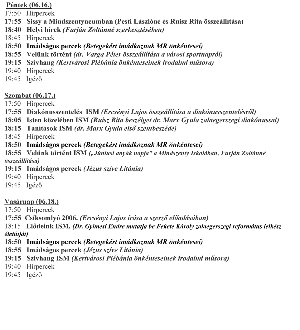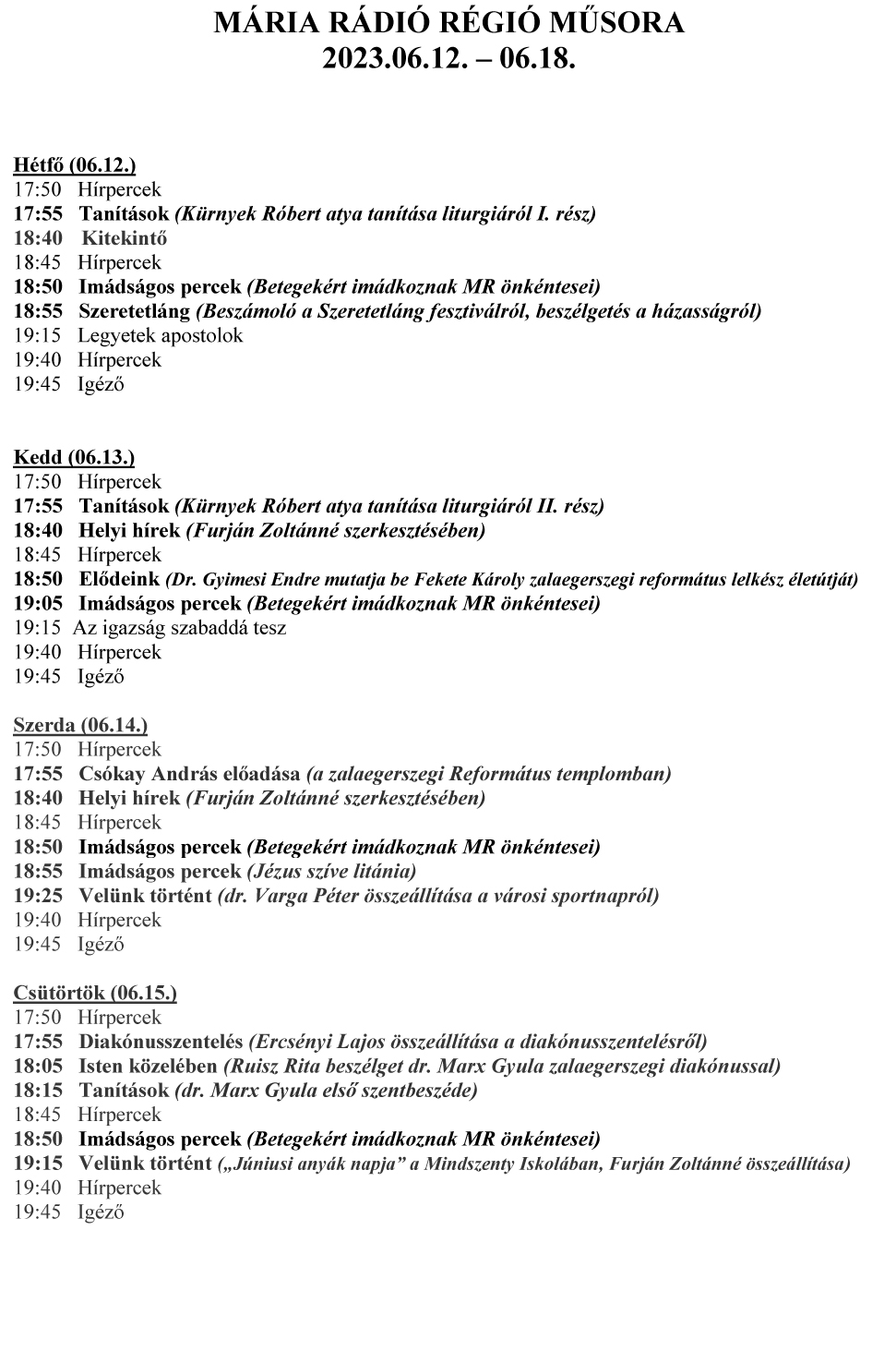 Mária Rádió Régió műsora Zalaegerszegről 2023.06.12. – 06.18.