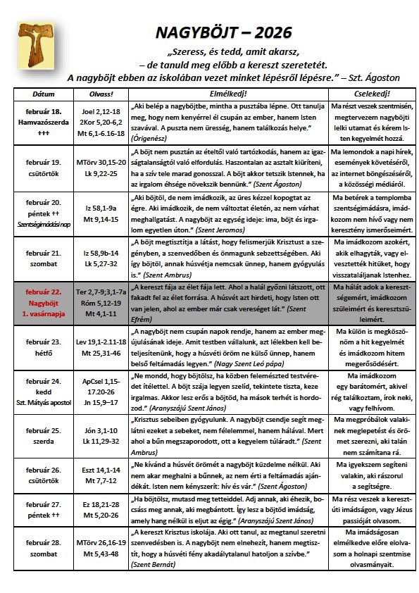Február 18-án hamvazószerdával kezdődik a húsvétot megelőző negyvennapos böjt, bűnbánati időszak – lemondás, hitben való elmélyülés, kiengesztelődés, – hogy méltóképpen felkészülhessünk Jézus Krisztus feltámadásának megünneplésére.