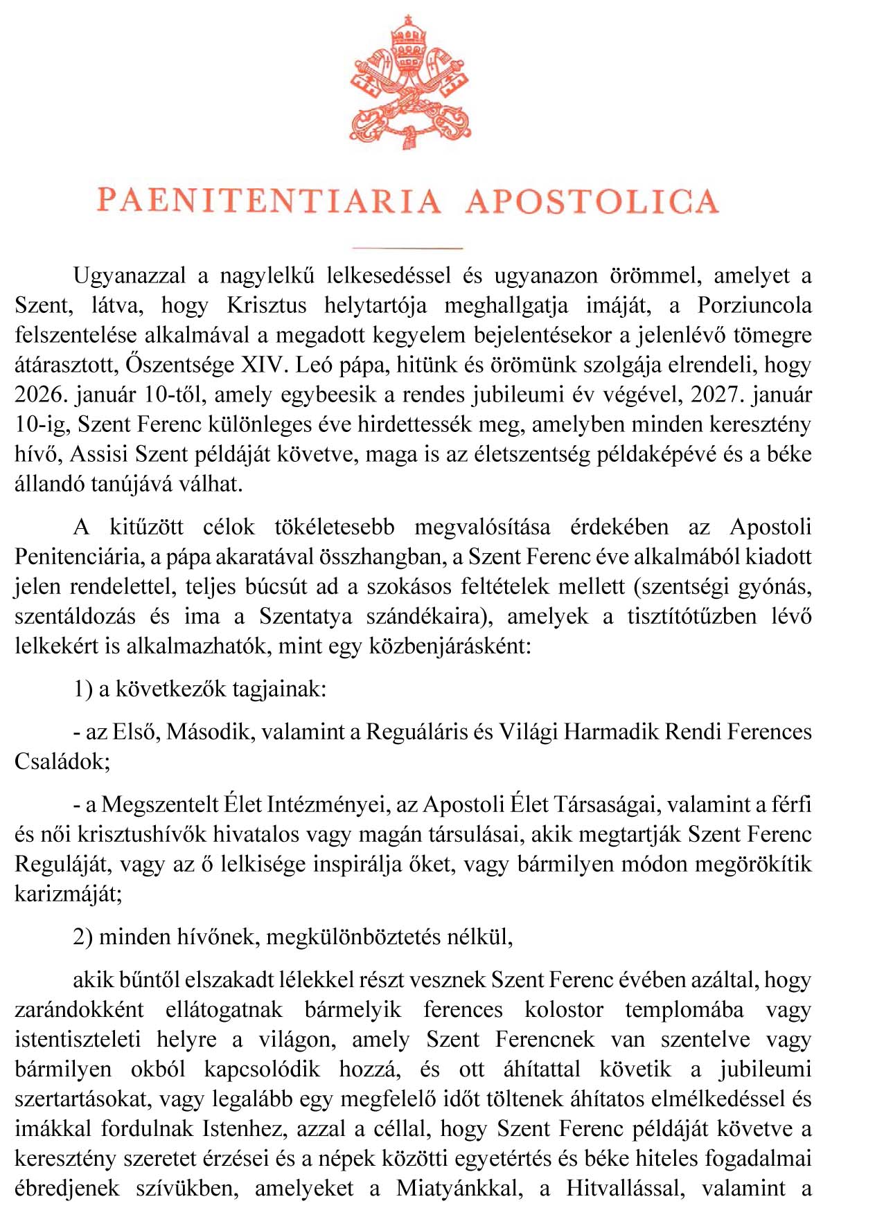 Decreto Indulgenza – HU-3 Közzétéve: 2026-01-19 - 1276 × 1745 - Teljes búcsú Assisi Szent Ferenc halálának 800. évfordulója alkalmából