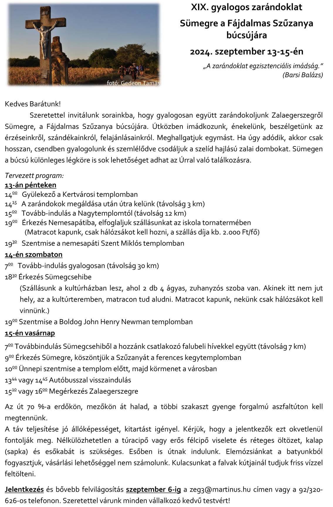 XIX. gyalogos zarándoklat Sümegre a Fájdalmas Szűzanya búcsújára 2024. szeptember 13-15-én 2024-08-25 by zalaferences